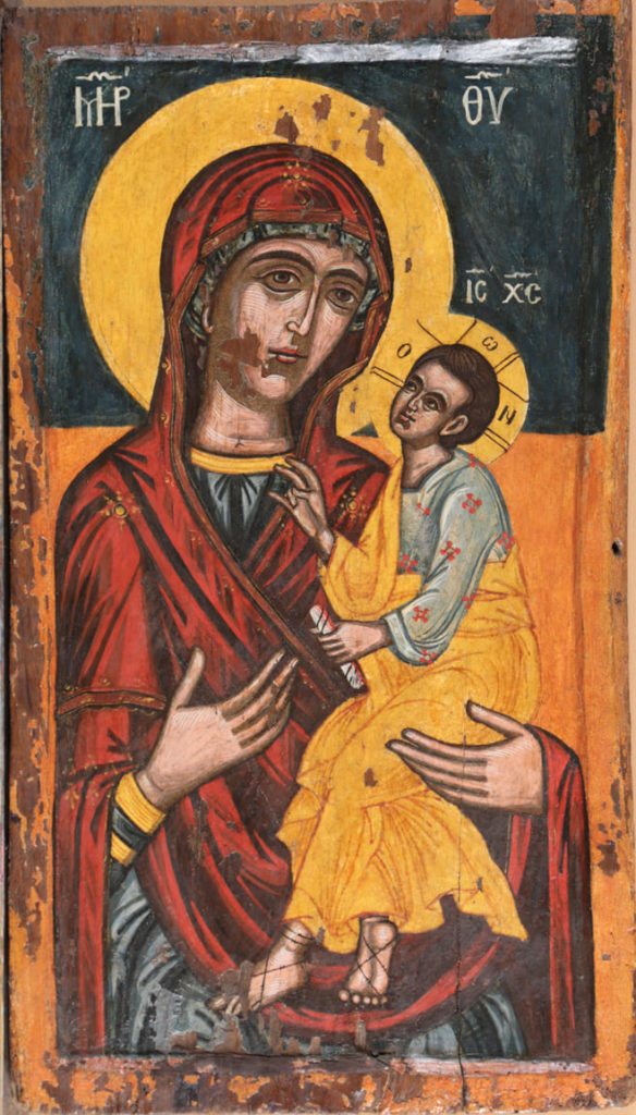 Ikona me përmasa 62cm x 35cm x 2cm paraqet një sfond të ndarë në dy ngjyra ku pjesa e sipërme ka ngjyre të gjelbër ndërsa ajo e poshtmja paraqitet në ngjyrë të verdhë. Figura kryesore, ajo e nënës së Zotit është pikturuar duke mbajtur në krahë fëmijën e saj Krishtin. Ikona është pikturuar gjatë fundit të shekullit të XVII- fillim shekullit të XVIII.