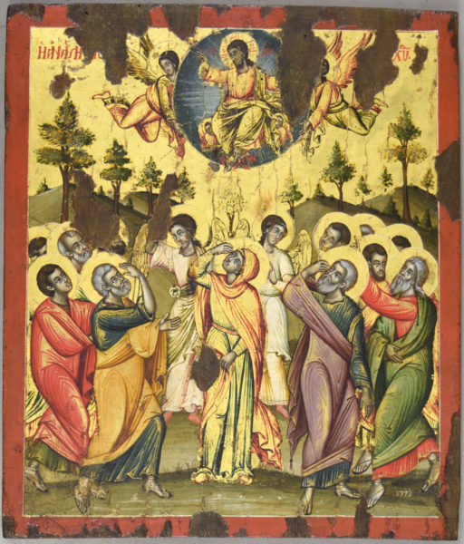 Në pjesën e sipërme të ikonës shfaqet një mandorla blu të cilën e mbajnë dy engjëj. Në mes të mandorlës shfaqet Krishti i ulur në një fron qiellor dhe në këmbët e tij shfaqen kerubimët. Poshtë Krishtit në një pozicion gjysmë-profil shfaqet Shën Mëria në mes të dishepujve. Pas saj shfaqen dy engjëj të cilët me njërën dorë tregojnë lart Krishtin. Tipi ikonografik i ikonës përkon me llojin e periudhës së paleologëve.