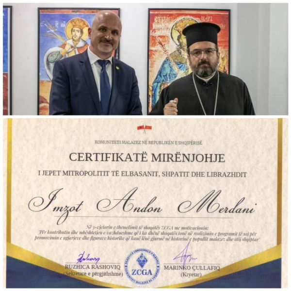 Me rastin e 3 vjetorit të themelimit të shoqatës ZCGA, vendosi të vlerësojë me një çertifikatë mirënjohjeje Mitropolitin e Elbasanit, Shpatit dhe Librazhdit, Imzot Andon Merdani, për mbështetjen e vazhdueshme që i ka dhënë programit tonë, veçanërisht në promovimin e Shën Vladimir i Duklës si figurë lidhëse midis popujve malazezë dhe shqiptarë.