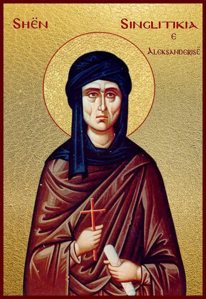 Nëna jonë e shenjtë Singlitikia lindi në Aleksandri, në shekullin e 4-t, nga prindër të pasur e besimtarë me prejardhje nga Maqedonia. Bukuria e saj e madhe, mençuria dhe virtytet e shumta bënin që të lakmohej që në moshë të re nga shumë mëtues, por ajo qëndronte e shurdhët dhe e verbër para gjithë tërheqjeve të kësaj bote, duke aspiruar martesën vetëm me Krishtin, Dhëndrin qiellor. E mundonte trupin me kreshmë dhe gjithë llojet e ashpërsive, e mblidhte mendjen pa kompromis në fund të zemrës dhe thërriste ditë e natë: “I dashuri im është imi, dhe unë jam e tij!” (Kënga e Këngëve 2.16).