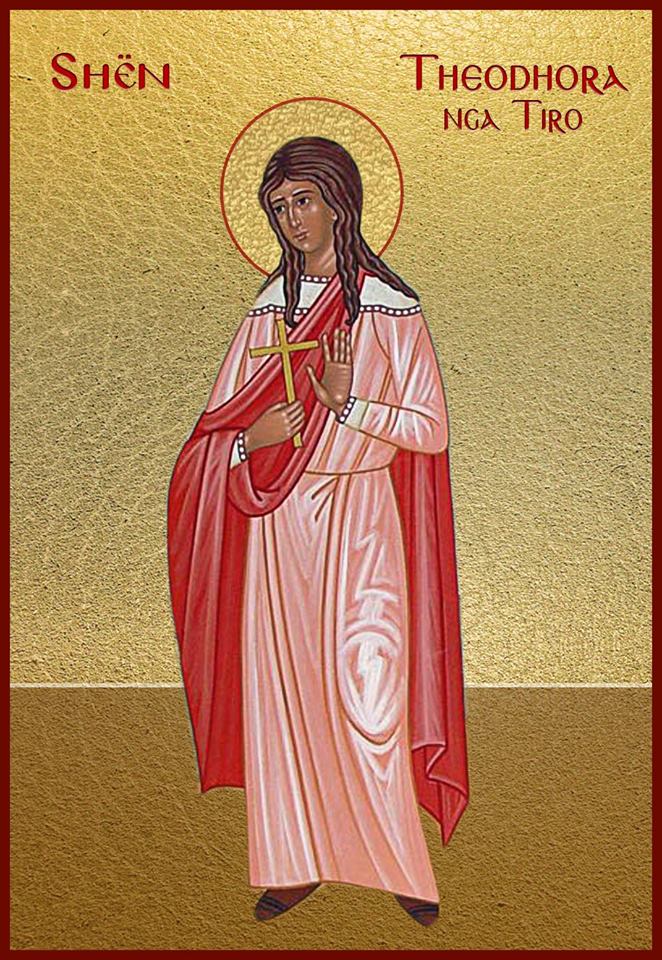 Ishte nga Tiro dhe që në moshën 17-vjeçare u vlerësua që të fitojë kurorën e martirizimit. Shën Theodhora kishte brenda saj hirin e Perëndisë, i cili jep urtësinë e vërtetë bijve të Tij besnikë, si edhe guximin dhe trimërinë të virgjërve. Pa u frikësuar, ajo pohoi përpara tiranit Urbani besimin e saj të krishterë. Tirani mendoi se nuk do të ishte aspak e vështirë të ndërronte besimin e asaj vajze 17-vjeçare me anë të premtimeve joshëse. Por ndodhi e kundërta. Theodhora i qëndroi besnike besimit të saj te Krishti. Atëherë Urbani, duke parë se përpjekjet e tij për ta bindur shenjtoren shkuan dëm, urdhëroi që ta torturonin.