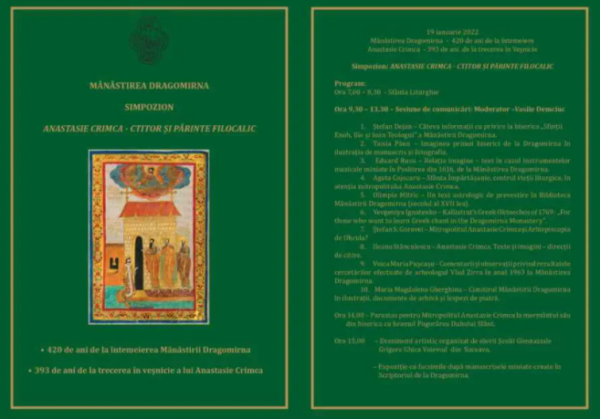 Mănăstirea Dragomirna va organiza miercuri, 19 ianuarie, simpozionul internațional intitulat „Anastasie Crimca – ctitor și părinte filocalic” cu prilejul împlinirii a 393 de ani de la trecerea în veșnicie a fostului Mitropolit al Moldovei. Totodată, evenimentul va marca împlinirea a 420 de ani de la întemeierea așezământului monahal.