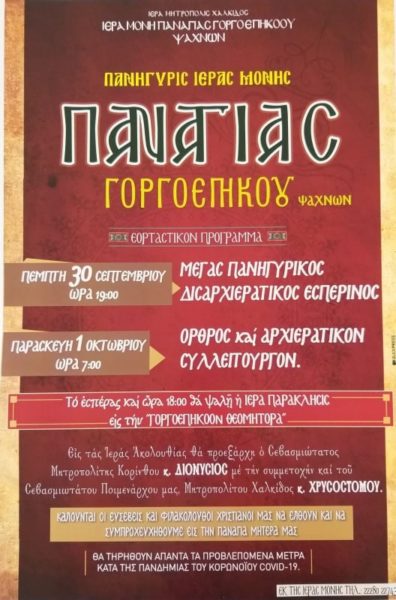 Η Ιερά Μητρόπολη Χαλκίδας ανακοίνωσε το πρόγραμμα του εορτασμού της Ιεράς Μονής Παναγίας Γοργοεπηκόου Ψαχνών. Την Πέμπτη 30 Σεπτεμβρίου 2021 και ώρα 19:00 θα πραγματοποιηθεί ο Πανηγυρικός Εσπερινός, ενώ την Παρασκευή 1 Οκτωβρίου και ώρα 07:00 ο όρθρος και το αρχιερατικό συλλειτουργό.