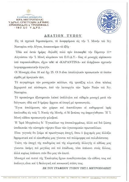 Σε επικοινωνία που είχε το Πρακτορείο με την Ιερά Μητρόπολη Ύδρας, Σπετσών και Αιγίνης, οι Ιερείς μας είχαν πει νωρίτερα ακριβώς τα ίδια, ενώ εξέδωσαν και την ανακοίνωση που ακολουθεί: