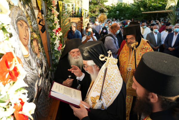 Με πομπή η ιερά εικόνα οδηγήθηκε στο εσωτερικό της Ιεράς Μονής όπου τοποθετήθηκε σε ειδικό προσκυνητάρι. Έπειτα ακολούθησε ο πανηγυρικός Αρχιερατικός Εσπερινός, προεξάρχοντος του Σεβ. Μητροπολίτου Κρήνης κ. Κυρίλλου. Κατά την διάρκεια του Εσπερινού χιλιάδες πιστοί προσκυνούσαν την νέα εικόνα της Παναγίας.
