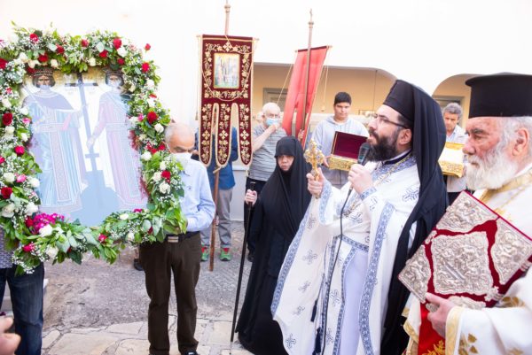 Κατά την σύντομη ομιλία του ο Πανοσιολ. Πρωτοσύγκελλος αναφέρθηκε στην προσωπικότητα του τιμωμένου Αγίου Κωνσταντίνου, με αφορμή το Απολυτίκιο του Αγίου και την ερμηνεία του και ευχήθηκε τα δέοντα προς την Οσιωτάτη Καθηγουμένη Γερόντισσα Γερασίμη και την Αδελφότητα.