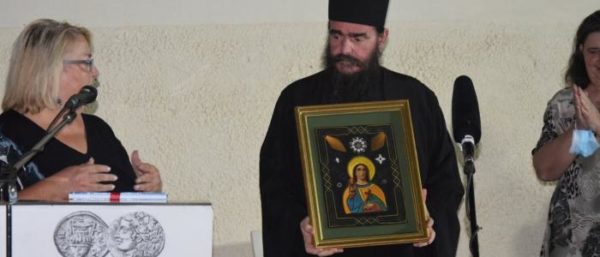 Συγκινητική υπήρξε η στιγμή όταν η Πρόεδρος του Συλλόγου «Οι Αινιάνες» κ. Μαρία Λαϊνά επέδωσε στον Ηγούμενο της Μονής π. Γερμανό μια χρυσοκέντητη εικόνα της Αγίας Βαρβάρας η οποία σώθηκε κατά τη διάρκεια της πυρπόλησης της Υπάτης από τα Γερμανικά στρατεύματα κατοχής τον Ιούνιο του 1944. «Το δώρο αυτό π. Γερμανέ έχει ιδιαίτερη αξία για εμένα γιατί αποτελεί οικογενειακό κειμήλιο καθώς το φιλοτέχνησε η γιαγιά μου στις αρχές τις δεκαετίας του ’30. Πλέον θα αποτελεί κειμήλιο για τη Μονή σας», υπογράμμισε η κ. Λαϊνά.