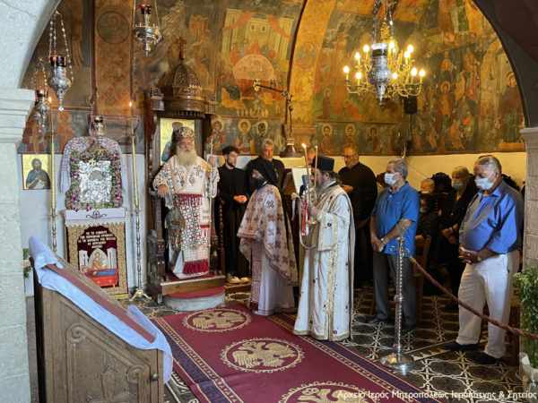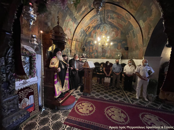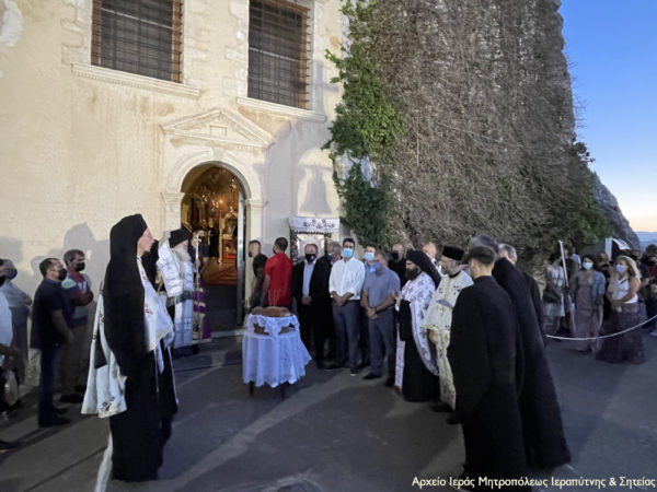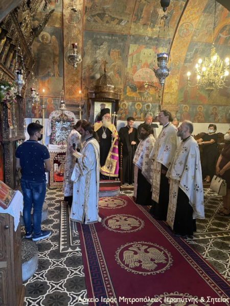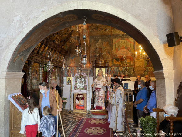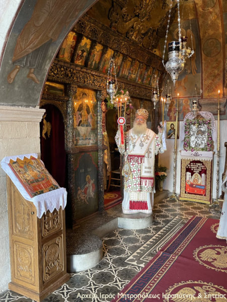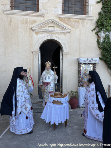 Ο Σεβ. Μητροπολίτης Ιεραπύτνης και Σητείας κ. Κύριλλος χοροστάτησε την παραμονή της εορτής στον μεγάλο πανηγυρικό εσπερινό, ενώ την κυριώνυμη ημέρα ιερούργησε στο σπηλαιώδες και κατανυκτικό Καθολικό της Μονής.
