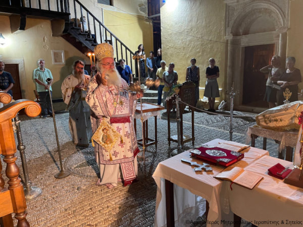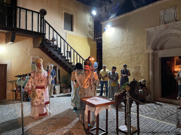 Προηγήθηκαν οι Ακολουθίες του Μικρού Εσπερινού και του Αποδείπνου από τον Ηγούμενο της Μονής Αρχιμ. Μεθόδιο Περάκη στο σπήλαιο που ασκήθηκε ο Όσιος, πάνω στην κόψη του επιβλητικού φαραγγιού των Περβολοκακίων. Ο Σεβ. Μητροπολίτης Ιεραπύτνης και Σητείας κ. Kύριλλος χοροστάτησε κατά την αγιορειτική τάξη στην ακολουθία του Μεγάλου Εσπερινού και της Λιτής, όπου ευλόγησε τους προσφερόμενους άρτους. Στη συνέχεια χοροστάτησε κατά την Ακολουθία του Όρθρου και τέλεσε την Θεία Λειτουργία. Εφέτος, λόγω του καύσωνα αλλά και των μέτρων προστασίας κατά του κορονωϊού, οι Ακολουθίες τελέσθηκαν στον αύλειο χώρο της Μονής.