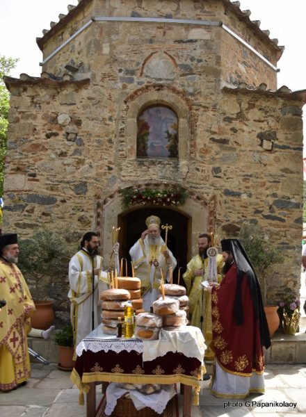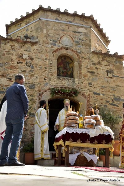 Μετά την Θεία Λειτουργία εψάλη η Αρτοκλασία και ευλογήθηκε το φαγητό – πανηγύρι, το οποίο προετοίμασαν εθελοντές, αξιοποιώντας τις προσφορές των τοπικών κτηνοτρόφων και προσεφέρθη σε όλους τους πανηγυριστές, ενώ ο Σεβασμιώτατος κήρυξε τον θείο λόγο, αναφερθείς στην ευεργεσία που απολαμβάνει η ανθρωπότητα, διά της Αναστάσεως του Ιησού Χριστού και στα άξια προσκυνήσεως μαρτύρια του Μεγαλομάρτυρος Αγίου Γεωργίου, τα οποία αποτελούν δόξα και καύχημα της Εκκλησίας και αιτία συγκινήσεως των χριστιανών, όπως αναφέρει η υμνογραφία της Εκκλησίας μας. Μάλιστα, ο Σεβασμιώτατος τόνισε διδακτικά, ότι προσκυνούμε οι πιστοί τα όργανα των βασανιστηρίων των Αγίων Μαρτύρων, διότι δι’ αυτών δόξασαν τον Χριστό και κατέθεσαν την ακλόνητη πίστη τους σε Εκείνον, όπως επίσης τιμούμε και προσκυνούμε τον Τίμιο και Ζωοποιό Σταυρό του Χριστού, διότι δι’ αυτού χαρίσθηκε στους καταδίκους της αμαρτίας η άφεση και ξανάνοιξε ο Παράδεισος.
