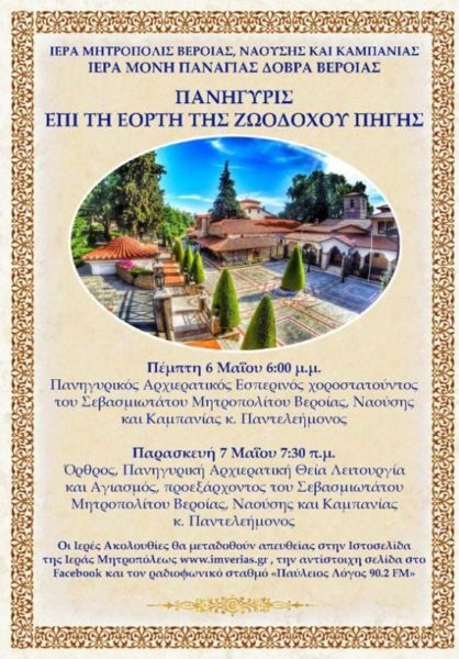 Όπως κάθε χρόνο, την Πέμπτη και την Παρασκευή της Διακαινησίμου πανηγυρίζει η Ιερά Μονή Παναγίας Δοβρά επί τη εορτή της Ζωοδόχου Πηγής, που αποτελεί την κυρία Πανήγυρη της Μονής. Φέτος, λόγω των περιοριστικών μέτρων οι Ιερές Ακολουθίες θα τελεστούν στον αύλειο χώρο της Ιεράς Μονής έμπροσθεν του θαυματουργού Αγιάσματος σύμφωνα με το παρακάτω πρόγραμμα: