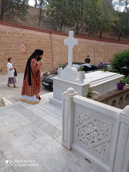 Ακολούθησε μικρά λιτάνευση πέριξ του Ιερού Ναού και εψάλλει Αρχιερατικό Τρισάγιο επί του Τάφου του αοιδίμου Μητροπολίτου Ύδρας Κυρού Ιεροθέου, του και κτίτορος του νέου παμμεγέθους Ιερού Ναού του Αγίου, τηρουμένων αυστηρά όλων των μέτρων κατά της πανδημίας.