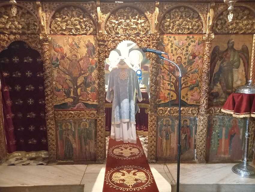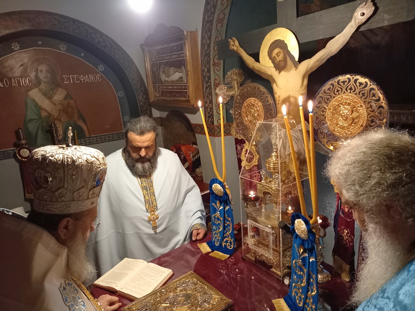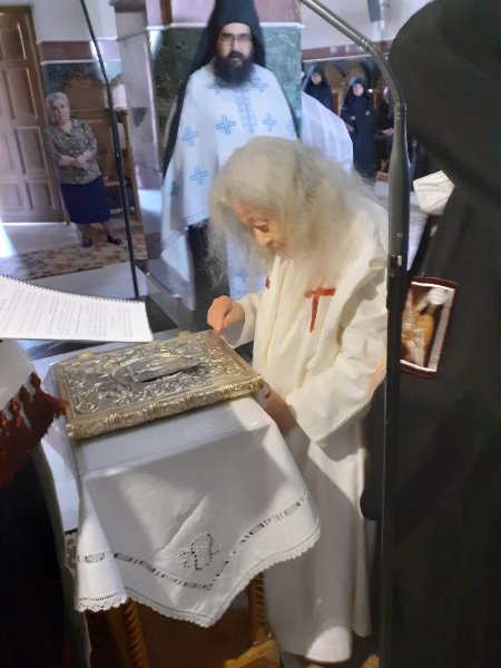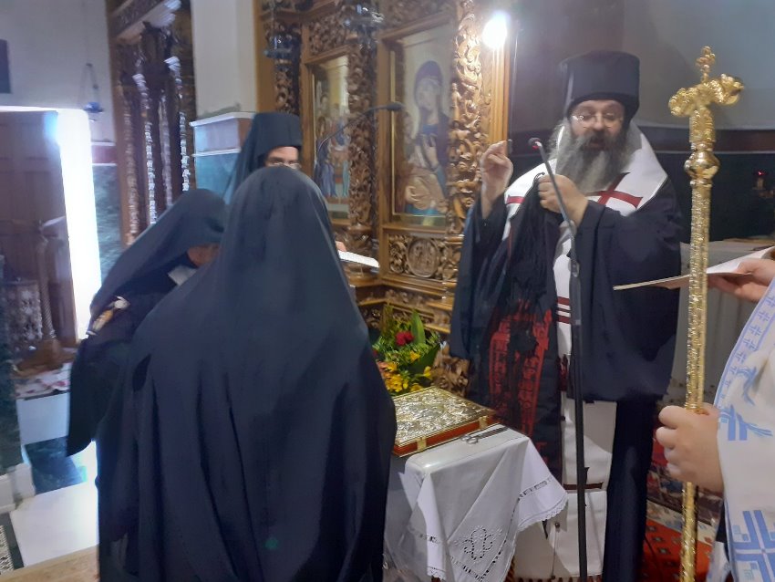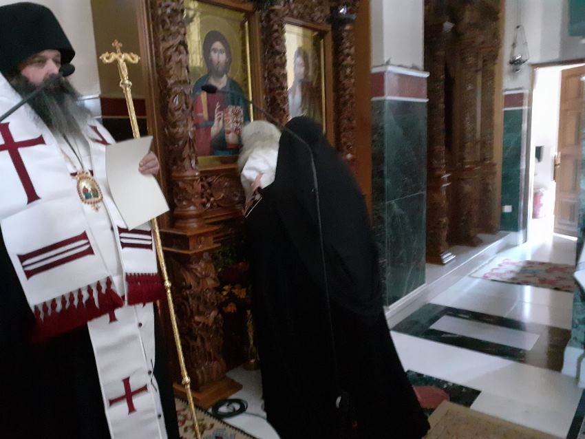 Το απόγευμα της Κυριακής μετέβη στο Ι. Ησυχαστήριο Τιμίου Σταυρού Μαψού, όπου τέλεσε, με την ευλογία του Σεβ. Μητροπολίτη Κορίνθου κ. Διονυσίου, Αρχιερατικό Εσπερινό, πλαισιούμενος υπό των Συγκέλλου π. Προδρόμου Αντωνίου, Ιερομονάχου π. Λογγίνου Αρχόντη, αδελφών της Ι. Μονής Αναστάσεως, και του Διακόνου π. Γεωργίου Μαρινάκη και την Κουρά εις Μεγαλόσχημον Μοναχήν της δοκίμου Μοναχής Ελευθερίας Βασιλάκη, μετονομασθείσης αυτής σε Προδρόμη Μοναχή.