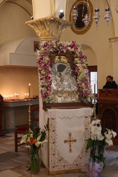 To Σάββατο του Λαζάρου, ημέρα κατά την οποία επανήρχετο κατά το πολυαιώνιο έθος η ιερά Εικόνα της Παναγίας Τουρλιανής από τη Χώρα Μυκόνου στο Μοναστικό της Ενδιαίτημα της Άνω Μεράς, ιερούργησε ο Σεβασμιώτατος κ. Δωρόθεος Β’, με την συμμετοχή του Ηγουμένου, Αρχιμ. Αλεξίου Παπαδόπουλου, και του Αρχιερατικού Επιτρόπου Μυκόνου και Εφημερίου του Μητροπολιτικού Ναού Ζωοδόχου Πηγής, ο οποίος εφέτος, υπό ομαλές συνθήκες, θα εφιλοξένει την Αγία Εικόνα, Πρωτοπρ. Πέτρου Μαραγκού, και την παρουσία πιστών, τηρούντων τα αναγκαία μέτρα προστασίας.