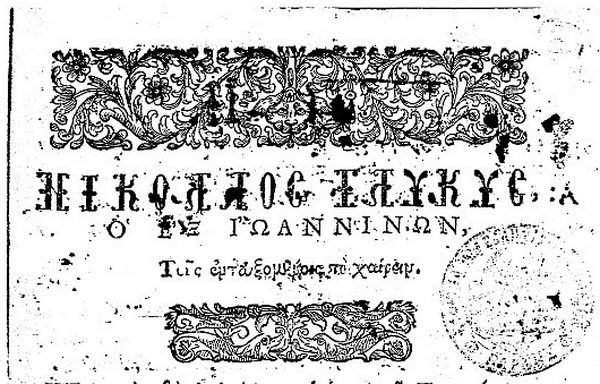 Από πρόλογο βιβλίου του Τυπογραφείου του Νικολάου του Γλυκέως του εξ Ιωαννίνων. Πρόκειται για το αντίτυπο του βιβλίου “Κατηχητικόν” του Αγίου Θεοδώρου Στουδίτου (έκδοση 1676) που εναπόκειται στη Βιβλιοθήκη του Φιλεκπαιδευτικού Συλλόγου