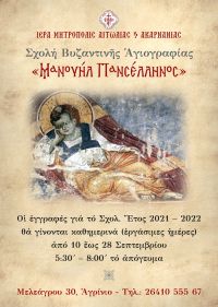 Ξεκίνησαν από την Παρασκευή 10 Σεπτεμβρίου 2021, να πραγματοποιούνται οι εγγραφές στη Σχολή Βυζαντινής Αγιογραφίας «ΜΑΝΟΥΗΛ ΠΑΝΣΕΛΗΝΟΣ» της Ιεράς Μητροπόλεως Αιτωλίας και Ακαρνανίας που βρίσκεται στο Αγρίνιο.