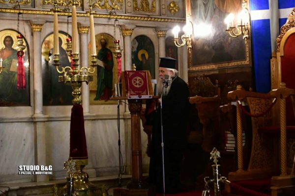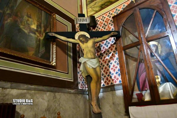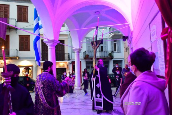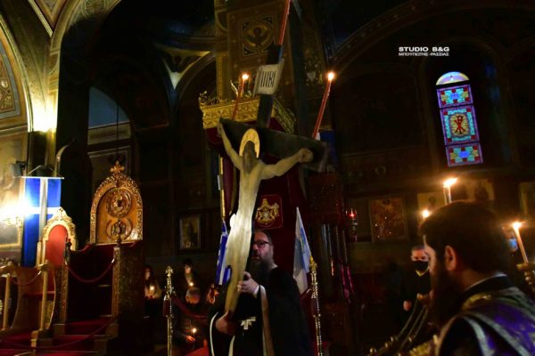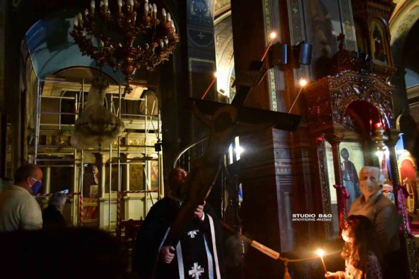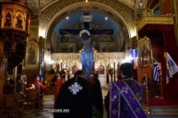 Με όλα τα μέτρα για την τήρηση της υγειονομικής ασφάλειας των πιστών, τελέσθηκε η ακολουθία των Παθών και του όρθρου της Μεγάλης Παρασκευής στον Μητροπολιτικό Ιερό ναό του Αγίου Γεωργίου στο Ναύπλιο την Μεγάλη Πέμπτη 29 Απριλίου 2021.
