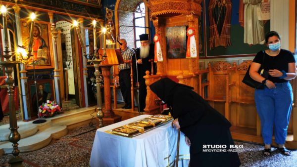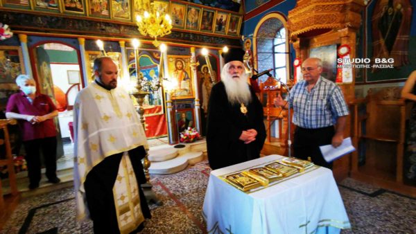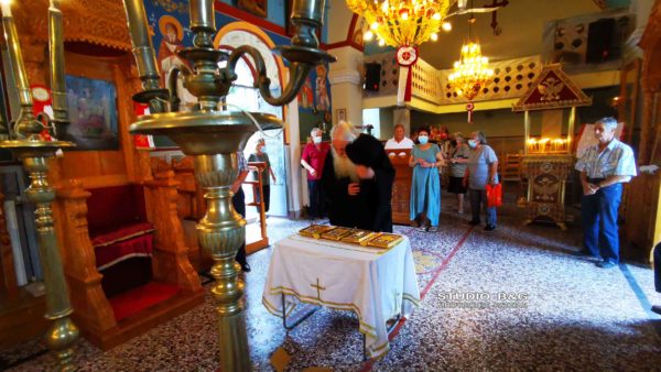 Προς προσκύνηση τέθηκαν και Ιερά λείψανα Αγίων, που έφερε μαζί του ο Μητροπολίτης Αργολίδος προς ευλογία του τόπου και των κατοίκων.