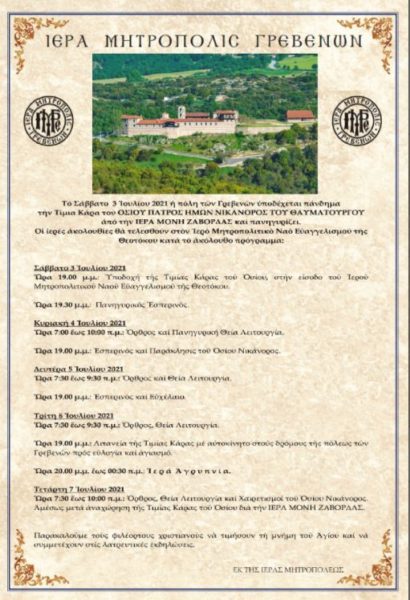 Το Σάββατο 3 Ιουλίου 2021 τα Γρεβενά θα υποδεχτούν την Τίμια Κάρα του Οσίου Νικάνορος του Θαυματουργού από την Ιερά Μονή Ζάβορδας. Οι Ιερές Ακολουθίες θα τελεστούν στον Ιερό Μητροπολιτικό Ναό του Ευαγγελισμού της Θεοτόκου. Την Τρίτη θα τελεστεί λιτανεία της Τιμίας Κάρας με αυτοκίνητο στους δρόμους της πόλης για ευλογία και αγιασμό.