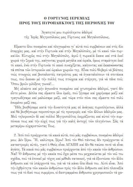 Ἀγαπητοί μου πυρόπληκτοι ἀδελφοί τῆς Ἱερᾶς Μητροπόλεώς μας Γόρτυνος καί Μεγαλοπόλεως,