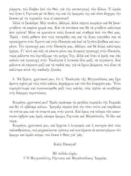 Ἀλλά τό ξαναλέμε: Μήν πονᾶτε, ἀδελφοί, ἀλλά πάρετε κουράγιο καί θά ξαναφτιάξετε τά καμένα χωριά σας. Καί τά σπιτάκια σας θά τά φτιάξετε καλύτερα ἀπό πρῶτα! Μόνο νά κρατιέστε πολύ δυνατά καί σταθερά ἀπό τόν Θεό μας. Ἐμεῖς – ἐσεῖς μάθατε ἀπό τούς πατεράδες σας καί τίς ἅγιες γιαγιάδες σας νά προσεύχεστε στόν Χριστό καί στήν Παναγία καί ἐκεῖ νά ζητᾶτε βοήθεια καί κουράγιο. Τήν προσευχή μας στήν Παναγία μας, ἀδελφοί, καί θά δοῦμε καλύτερες ἡμέρες.