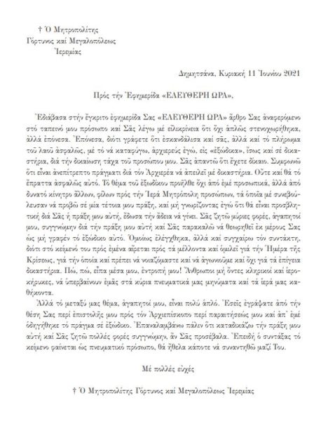 Επιστολή προς την Εφημερίδα “ΕΛΕΥΘΕΡΗ ΩΡΑ”, απέστειλε ο Σεβασμιώτατος Μητροπολίτης Γόρτυνος και Μεγαλοπόλεως κ. Ιερεμίας, όπως αυτή δημοσιεύεται εκ μέρους του επισήμου ιστοστόπου της Ιεράς Μητροπόλεως. Ο Σεβασμιώτατος κάνει λόγο για την πρόσφατη αναφορά της εφημερίδας περί επιστολής παραιτήσεώς του προς τον Μακαριώτατο Αρχιεπίκοπο, οπότε οδηγήθηκε στην απόφαση να κινηθεί νομικά εναντίον του μέσου. Ωστόσο, όπως χαρακτηριστικά αναφέρει ο Σεβασμιώτατος: “Συμφωνώ ότι είναι ανεπίτρεπτο πράγματι διά τον Αρχιερέα να απειλεί με δικαστήρια. Ούτε και θα το έπραττα ασφαλώς αυτό. Το θέμα του εξωδίκου προήλθε όχι από εμέ προσωπικά, αλλά από δυνατό κίνητρο άλλων, φίλων προς την Ιερά Μητρόπολη προσώπων, τα οποία με συνεβούλευσαν να προβώ σε μία τέτοια μου πράξη, και μη γνωρίζοντας εγώ ότι θα είναι προσβλητική διά Σας η πράξη μου αυτή, έδωσα την άδεια να γίνει. Σας ζητώ μύριες φορές, αγαπητοί μου, συγγνώμην διά την πράξη μου αυτή και Σας παρακαλώ να θεωρηθεί εκ μέρους Σας ως μη γραφέν το εξώδικο αυτό”.