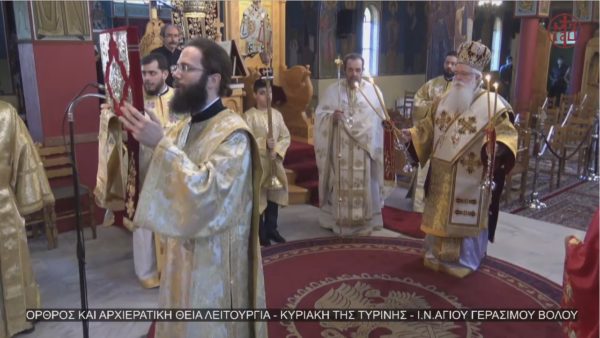 Στον Ιερό Ναό Αγίου Γερασίμου Βόλου λειτούργησε σήμερα, Κυριακή της Τυρινής, ο Σεβασμιώτατος Μητροπολίτης Δημητριάδος κ. Ιγνάτιος, κεκλεισμένων των θυρών, λόγω των μέτρων για την προστασία της δημόσιας υγείας.