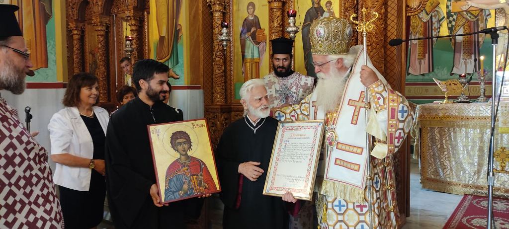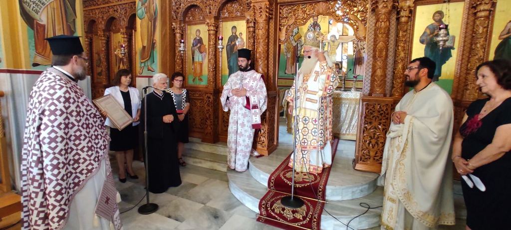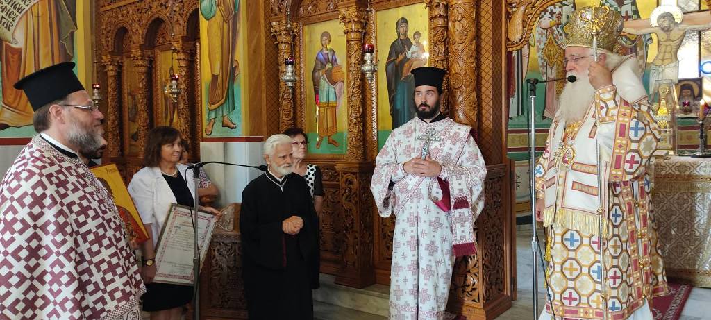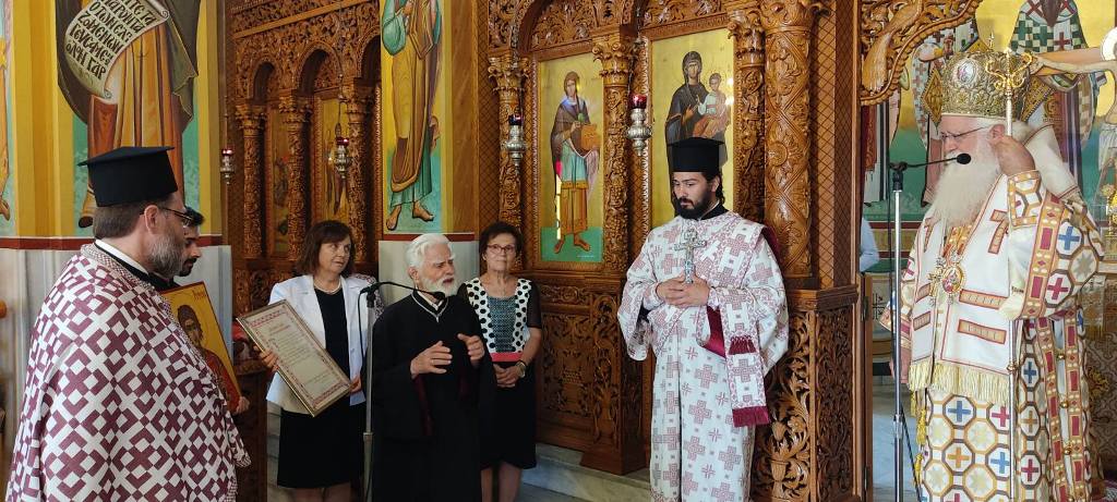 Στο τέλος της Θείας Λειτουργίας ο Σεβασμιώτατος απένειμε την οφειλόμενη τιμητική διάκριση στον επί σαράντα τρία χρόνια Λαμπαδάριο του Ναού κ. Φώτιο Ξηρομερίτη, ο οποίος πλέον αποσύρεται από την ενεργό υπηρεσία.