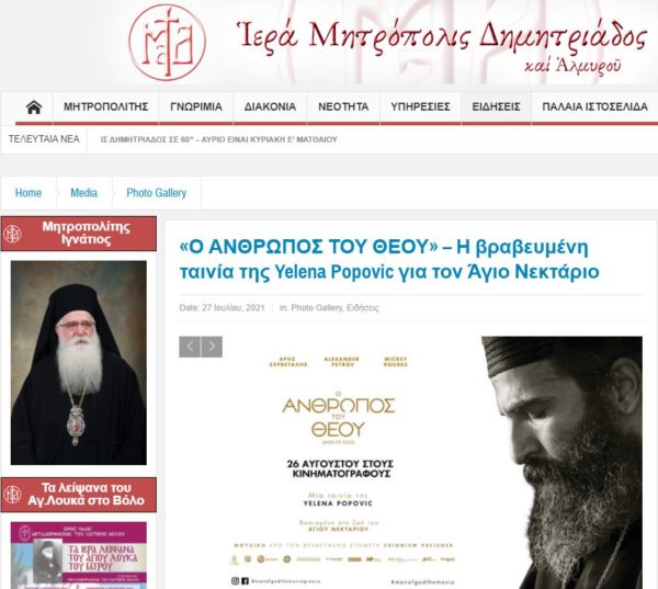 Σε λιγότερο από έναν μήνα, στους κινηματογράφους! Ο επίσημος ιστοτόπος της Ιεράς Μητροπόλεως Δημητριάδος και Αλμυρού, με επίκαιρη ανάρτησή του, αναφέρεται στη ταινία «Ο ΑΝΘΡΩΠΟΣ ΤΟΥ ΘΕΟΥ» (Μan of God) που πραγματεύεται κινηματογραφικά τον Βίο του Αγίου Νεκταρίου Πενταπόλεως.