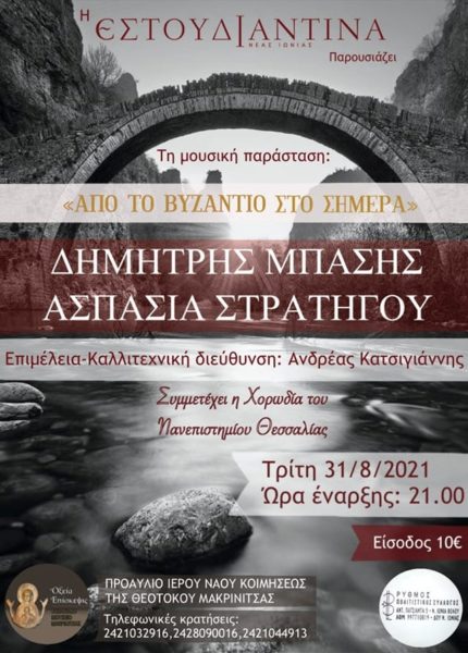 Η Εστουδιαντίνα Νέας Ιωνίας παρουσιάζει τη μουσική παράσταση “ΑΠΟ ΤΟ ΒΥΖΑΝΤΙΟ ΣΤΟ ΣΗΜΕΡΑ” με τον Δημήτρη Μπάση και την Ασπασία Στρατηγού, την ερχόμενη Τρίτη 31 Αυγούστου και ώρα 21:00, στο Προαύλιο του Ιερού Ναού Κοιμήσεως της Θεοτόκου Μακρινίτσας.