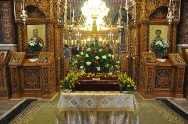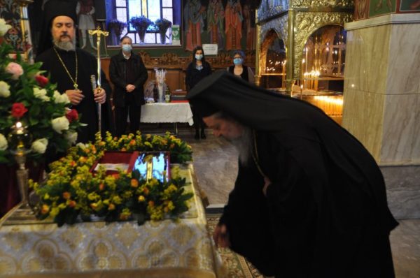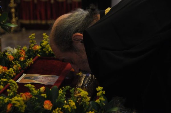 Πριν την απόλυση εψάλησαν τα εγκώμια του Οσίου Γεωργίου και ακολούθησε εντός του Ιερού Ναού λιτανεία του ιερού λειψάνου του.