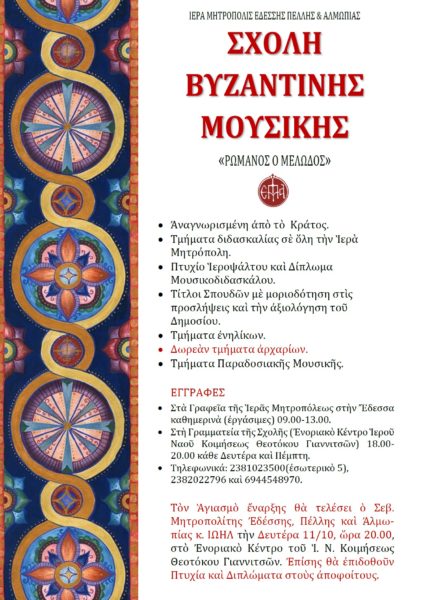 Άρχισαν οι εγγραφές στην Σχολή Βυζαντινής Μουσικής της Ιεράς Μητροπόλεως Εδέσσης, Πέλλης και Αλμωπίας για το νέο διδακτικό έτος 2021-22.