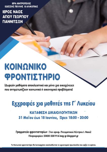 Την έναρξη των εγγραφών για τους μαθητές της Γ΄ Λυκείου στα δωρεάν φροντιστηριακά μαθήματα που διοργανώνει η ενορία Αγίου Γεωργίου Γιαννιτσών για το σχολικό έτος 2021-2022 από τις 31 Μαΐου 2021 ανακοινώνει η Ιερά Μητρόπολη Εδέσσης, Πέλλης και Αλμωπίας.