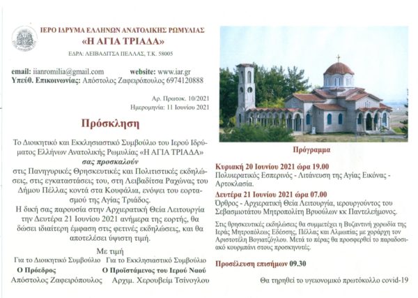 Οι Ανατολικορωμυλιώτες τιμούν Την Αγία Τριάδα και σας προσκαλούν να συμμετάσχετε στις θρησκευτικές εκδηλώσεις, που θα λάβουν χώρα από την Κυριακή, 20 Ιουνίου, στο Ιερό Ίδρυμα Ελλήνων Ανατολικής Ρωμυλίας «Η Αγία Τριάδα» στη Λειβαδίτσα Ραχώνας του Δήμου Πέλλας, κοντά στα Κουφάλια.
