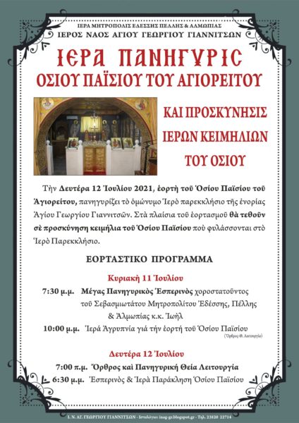 Την Δευτέρα 12 Ιουλίου, εορτή του Οσίου Παϊσίου του Αγιορείτου, πανηγυρίζει το ομώνυμο Ιερό παρεκκλήσιο της ενορίας Αγίου Γεωργίου Γιαννιτσών. Στα πλαίσια του εορτασμού θα τεθούν σε προσκύνηση κειμήλια του Οσίου Παϊσίου, τα οποία φυλάσσονται στο Ιερό Παρεκκλήσιο.