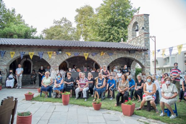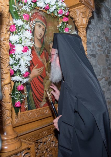 Πριν το τέλος του εσπερινού έλαβε χώρα η λιτάνευση της Εικόνας της Θεοτόκου, η οποία εναποτέθηκε σε κουβούκλιο, όπου και εψάλησαν υπό του Σεβασμιωτάτου τα καθιερωμένα Εγκώμια της Παναγίας. Τέλος, ο Σεβασμιώτατος απευθυνόμενος προς τους εκατοντάδες ευλαβείς προσκηνητές ευχήθηκε τα δέοντα.
