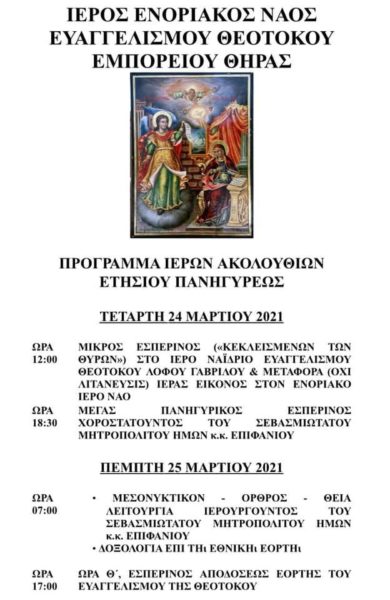 Αρχίζει από αύριο το μεσημέρι ο εορτασμός της μεγάλης Θεομητορικής ημέρας στον Ιερό Ενοριακό Ναό Ευαγγελισμού της Θεοτόκου Εμπορείου Θήρας (Σαντορίνης).