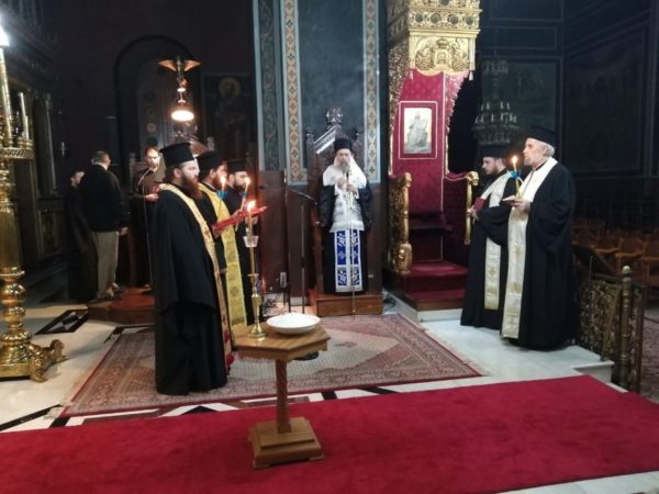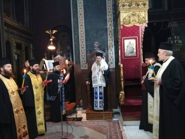Στη συνέχεια, χοροστάτησε στην ακολουθία του Εσπερινού και προ της απολύσεως, τέλεσε το ιερό μνημόσυνο υπέρ αναπαύσεως του μακαριστού Μητροπολίτου.