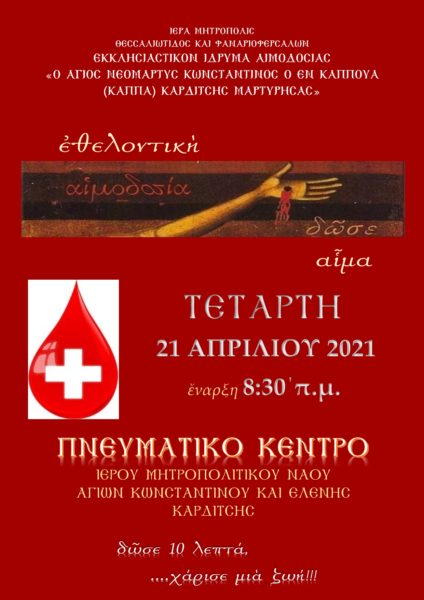 Εθελοντική Αιμοσοδία θα λάβει χώρα την Τετάρτη 21 Απριλίου στο Πνευματικό Κέντρο του Ιερού Μητροπολιτικού Ναού Αγίων Κωνσταντίνου και Ελένης Καρδίτσας με ώρα έναρξης τις 8.30 π.μ.
