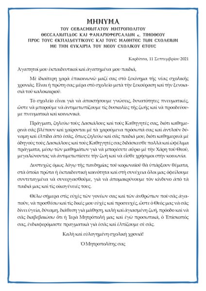 Ο Σεβασμιώτατος Μητροπολίτης Θεσσαλιώτιδος και Φαναριοφερσάλων κ. Τιμόθεος εξέδωσε μήνυμα επί τη ενάρξει του νέου σχολικού έτους 2021-2022.