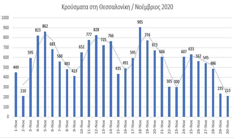 Χαρακτηριστικό τῆς εἰκόνας ποὺ εἶχε ΗΔΗ δημιουργηθεῖ στὴν πόλη καὶ τῆς πορείας τῆς ἀσθένειας, ποὺ ΗΔΗ βρισκόταν σὲ φάση ἐκθετικῆς αὔξησης εἶναι ὅτι σύμφωνα μὲ δημοσίευμα τῆς 22ας Ὀκτωβρίου «Σοκάρει η αύξηση 500% στο ιικό φορτίο των λυμάτων της Θεσσαλονίκης», μὲ ἄλλο δημοσίευμα τῆς 24ης Ὀκτωβρίου «ενδεικτική είναι η ραγδαία αύξηση των κρουσμάτων στη Θεσσαλονίκη όπου πλέον εκεί διαμένει τουλάχιστον ένας στους πέντε φορείς του επικίνδυνου ιού, σε όλη την Ελλάδα. Το ποσοστό της συμπρωτεύουσας προ 20ημέρου είχε κατέλθει στο 3-5% αυτών όλης της Ελλάδας (το καλοκαίρι ήταν της τάξης του 17%). Κι από τότε υπάρχει ραγδαία άνοδος με το 51% των ενεργών κρουσμάτων στη συμπρωτεύουσα να είναι ηλικίας 18 έως 29 ετών, όπως επεσήμανε χθες στην συνέντευξη Τύπου ο υφυπουργός Πολιτικής Προστασίας κ Νίκος Χαρδαλιάς», ἐνῶ σὲ ἄλλο δημοσίευμα, ποὺ ἀπέχει χρονικὰ δύο ἑβδομάδες ἀπὸ τὴν 26/10 (χρονικό διάστημα τὸ ὁποῖο σύμφωνα μὲ τοὺς εἰδικοὺς ἀπαιτεῖται γιὰ τὴν ἐκδήλωση τῶν ἀποτελεσμάτων διασπορᾶς τοῦ ἰοῦ), γίνεται μεν μία ἀπόπειρα σύνδεσης μὲ τοὺς ἑορτασμοὺς τοῦ ἁγίου Δημητρίου («στο τριήμερο των εορτασμών της πόλης καταγράφονται φαινόμενα συνωστισμού»), ἀλλὰ καθὼς καταγράφονται ἀριθμητικὰ τὰ κρούσματα στὴν πόλη, ἐμφανίζεται μικρὴ πτώση δύο ἑβδομάδες μετὰ τὴν 26/10: [Τὰ στοιχεῖα ποὺ παρατίθενται, συλλέχθηκαν ἀπὸ τὸ συγκεκριμένο ἄρθρο καὶ δύο σχετικοὺς πίνακες, ὅπου ὁ ἐνδιαφερόμενος μπορεῖ νὰ ἐξετάσει τὴν πορεία τῶν κρουσμάτων στὴν πόλη μας ἀναλυτικὰ, γιὰ τὸ διάστημα 1η Ὀκτωβρίου ἔως 2α Δεκεμβρίου(εἰκ.1 ) καὶ συγκεντρωτικὰ γιὰ τὸν μῆνα Νοέμβριο(εἰκ. 2)]: