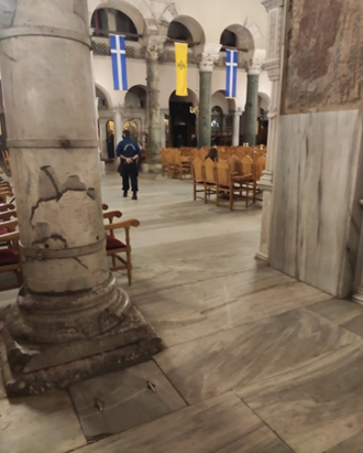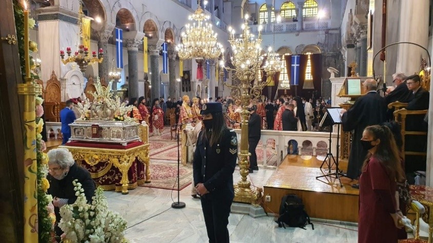 Ἄλλωστε, ἀφ΄ ἧς στιγμῆς οἱ πιστοὶ, ἀπὸ τὴν ὥρα ποὺ εἰσέρχονταν στὸν Ναὸ συνοδεύονταν ἀπὸ ὄργανα τῆς Ἀστυνομίας (εἰκ. 3), τὰ ὁποῖα τοὺς ἀκολουθοῦσαν μέχρι καὶ τὴν ἔξοδο τους ἀπὸ αὐτὸν, δὲν θὰ μποροῦσε νὰ συνεχισθεῖ κατὰ τὸν ἴδιο τρόπο τὸ προσκύνημα πρὶν τὴν ἄφιξη τῆς κ. Προέδρου, ἀλλὰ καὶ κατὰ τὴν διάρκεια τῆς ἐπίσημης Δοξολογίας, ὥστε νὰ μὴν δημιουργηθεῖ συνωστισμὸς ἐκτὸς τοῦ Ναοῦ; Τὶ θὰ ἔπρεπε νὰ γίνει; Τὶς ἡμέρες ἐκεῖνες δὲν εἶχε ἐπιβληθεῖ στὴν πόλη lockdown! Νὰ ἀπαγορευόταν ἐντελῶς ἡ προσέλευση τοῦ κόσμου; Ἐντὸς τοῦ Ναοῦ δὲν ἐπιτρεπόταν ἡ παραμονὴ, ἐκτὸς τοῦ Ναοῦ ἐμποδίζονταν ἡ ἀναμονὴ, ἄς σφράγιζαν λοιπὸν τὸν Ναὸ ἤ ἄς τὸν περιέφρατταν κυκλόθεν σὲ ἀπόσταση 300 μέτρων γιὰ νὰ μὴν δύναται κανεὶς νὰ πλησιάσει!