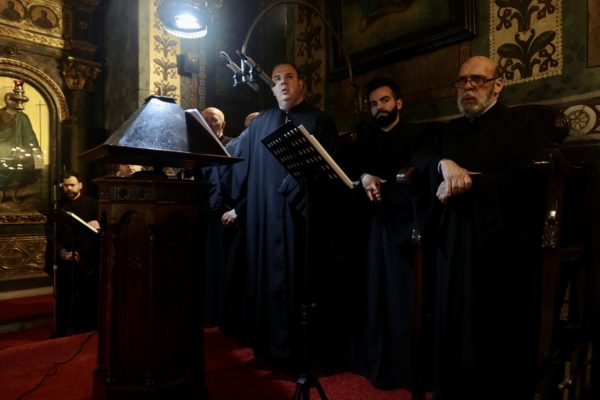 Τους ύμνους απέδωσαν ιεροπρεπώς και με κατάνυξη οι χοροί των ιεροψαλτών, με προεξάρχοντα στον δεξιό χορό τον κ. Στυλιανό Ζαχαρίου και στον αριστερό τον κ. Χρήστο Τογκαριδη.