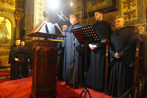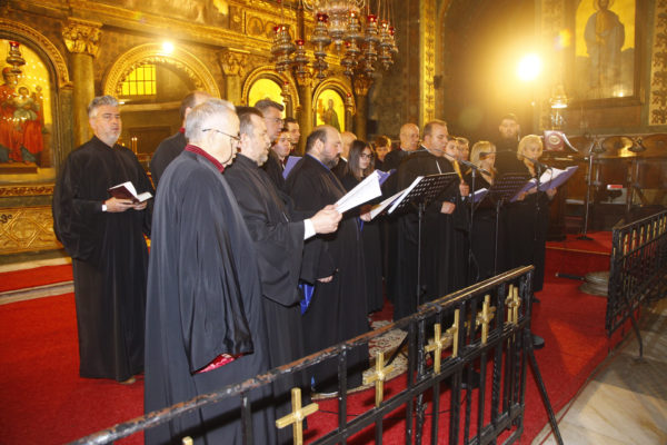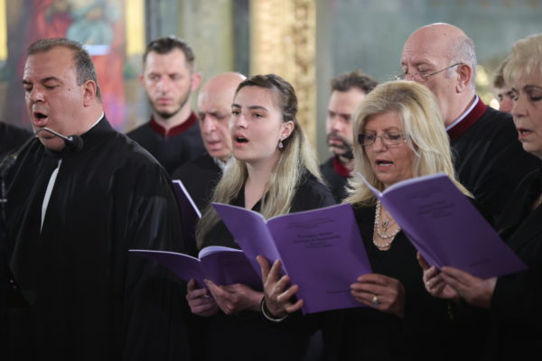 Τους ύμνους απέδωσαν ιεροπρεπώς και με κατάνυξη οι χοροί των ιεροψαλτών μαζί με τις χορωδίες τους , με προεξάρχοντα στον δεξιό χορό τον κ. Στυλιανό Ζαχαρίου και στον αριστερό τον κ. Χρήστο Τογκαριδη.