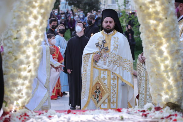 Αμέσως μετά τα Εγκώμια και τα Αναστάσιμα Ευλογητάρια, οι ιερείς χωρίς την παρουσία πιστών, πραγματοποίησαν την περιφορά του Επιταφίου στον αύλειο χώρο του Καθεδρικού Ναού.