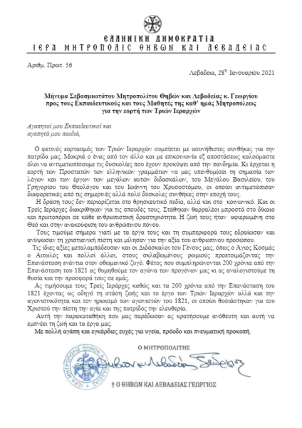 29/01/2021 29/01/2021 Στο έργο και τις αξίες που μεταλαμπάδευσαν οι Τρεις Ιεράρχες στάθηκε ο Σεβασμιώτατος Μητροπολίτης Θηβών και Λεβαδείας κ. Γεώργιος στο φετινό του μήνυμα προς τους Εκπαιδευτικούς και τους Μαθητές της Μητροπόλεώς του για την εορτή της Παιδείας και των Γραμμάτων. Από κάτω ακολουθεί το πρόγραμμα των εορτασμών των Τριών Ιεραρχών στη Θήβα.