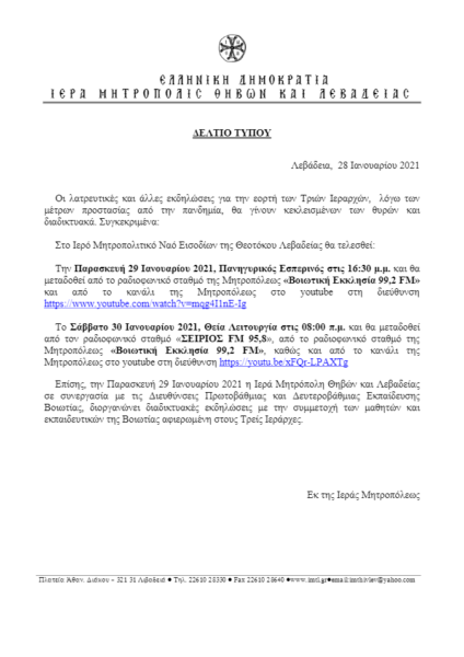 Από κάτω ακολουθεί το πρόγραμμα των εορτασμών των Τριών Ιεραρχών στη Θήβα.
