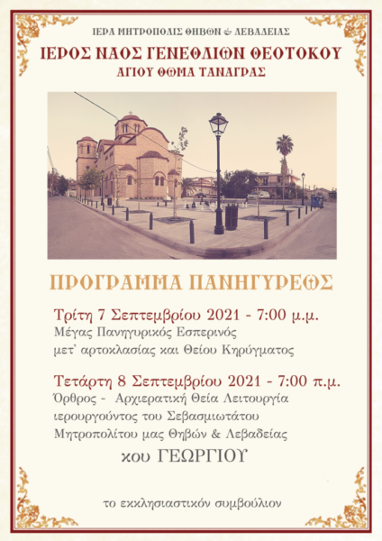 Ο Ιερός Ναός Γενεθλίου της Θεοτόκου θα εορτάσει πανηγυρικά την εορτή στις 7 και 8 Σεπτεμβρίου, στον Άγιο Θωμά Τανάγρας, της Ιεράς Μητροπόλεως Θηβών και Λεβαδείας.