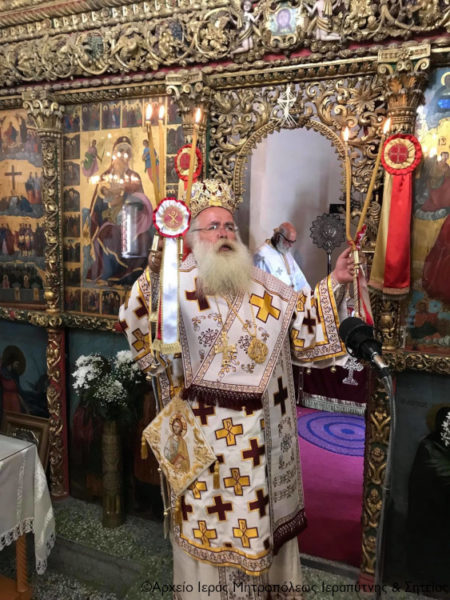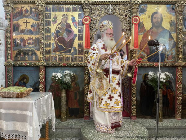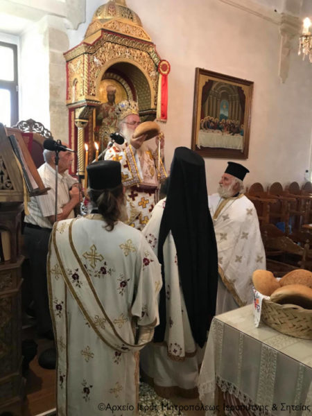 Ο Σεβασμιώτατος Μητροπολίτης Ιεραπύτνης και Σητείας κ. Kύριλλος χοροστάτησε κατά την ακολουθία του Όρθρου, ευλόγησε τους προσφερόμενους άρτους και στη συνέχεια τέλεσε τη Θεία Λειτουργία, κήρυξε τον Θείο Λόγο και κατά το εκκλησιαστικό έθος, μετά την Οπισθάμβωνο Ευχή, ευλόγησε τα πρώτα σταφύλια.