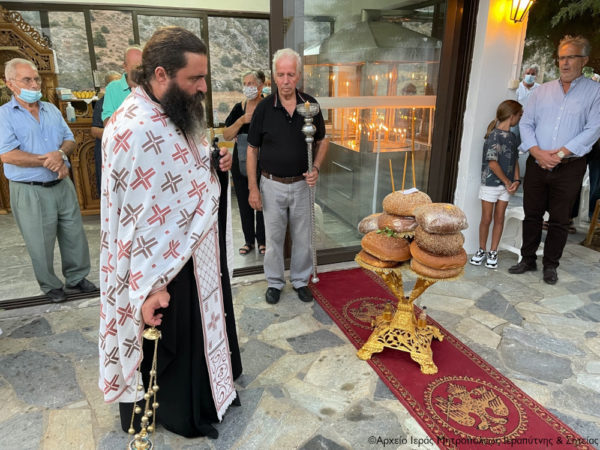 Μετά την ευλόγηση των προσφερόμενων άρτων ο Σεβασμιώτατος αναφέρθηκε δι᾽ ολίγων στη μεγάλη θεομητορική εορτή της κοιμήσεως της Θεοτόκου και στο ιερό πρόσωπο της Θεομήτορος.